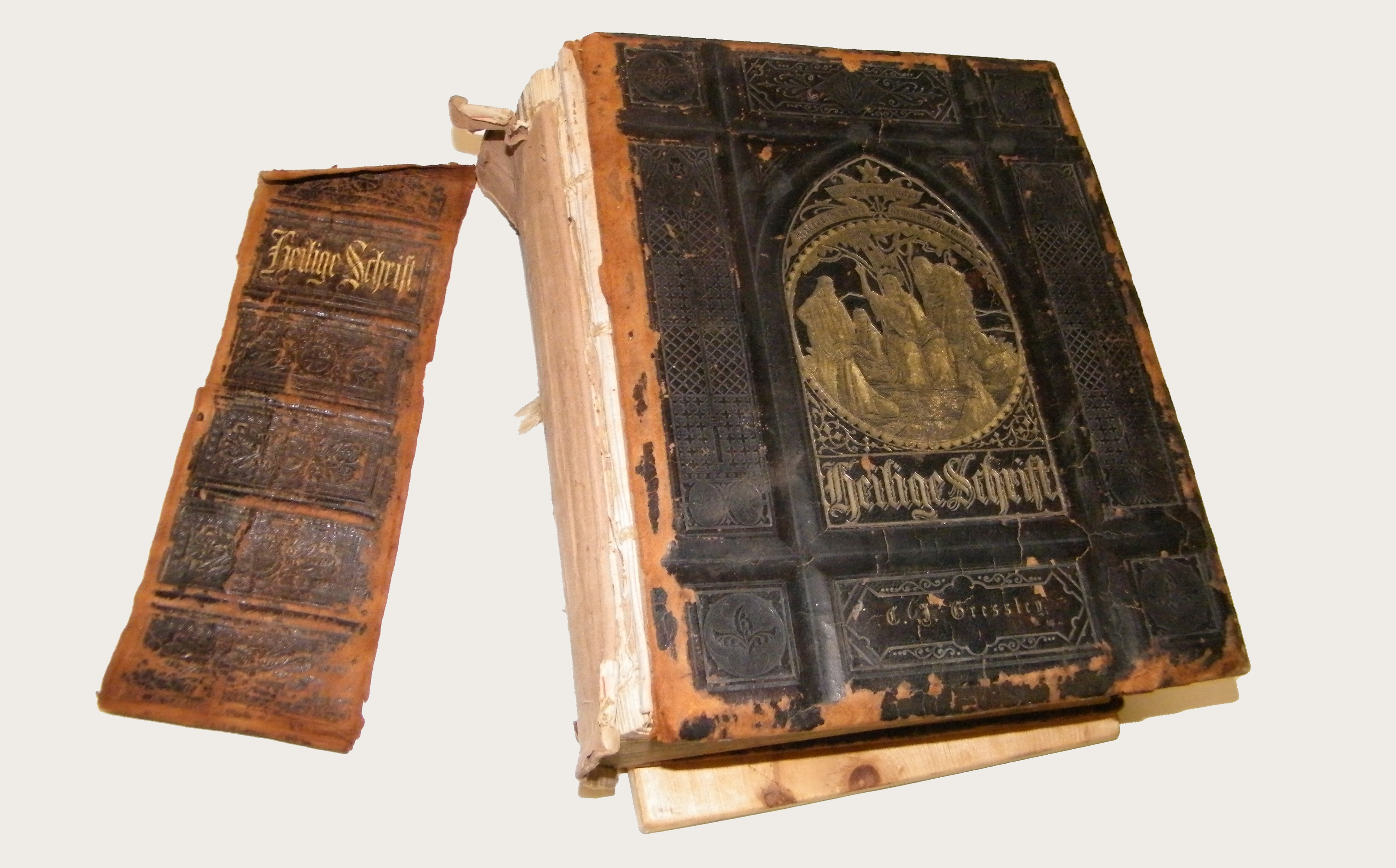 Return your deteriorating or damaged family bible bindings and covers into an attractive and usable family reference and treasure. Dague Bookbindery can create new leather spines, corners, and other customized features such as raised bands, ribbon markers, headbands, and a range of plain and decorative end sheets. Covers are treated and polished to help preserve the original materials.